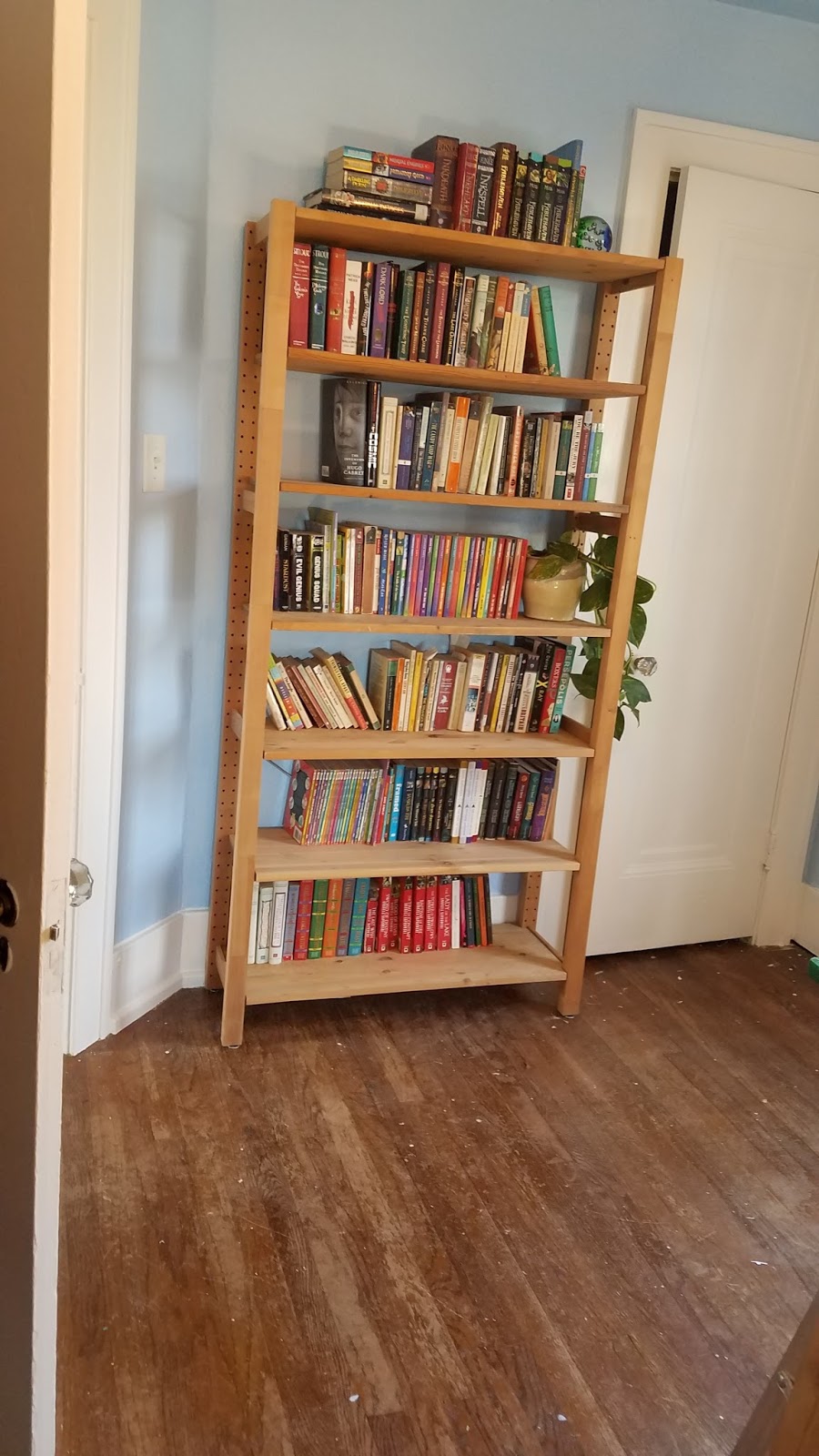 Much better. What you can't see in this photo is that pulling those shelves away from around the door left raw plaster where baseboards and wood trim should be. So I had to make yet ANOTHER trip to Home Depot and rig something together.And now the shelves get assembled. Enough jokes about how impossible assembling IKEA furniture is so I will set those aside and simply join the chorus and say, "IVAR ain't fun."